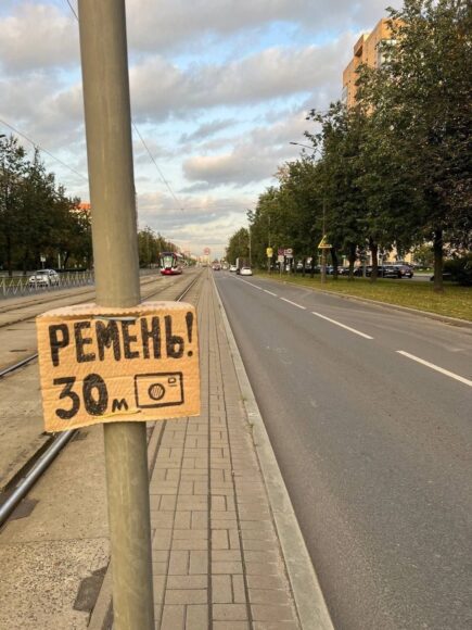 Петербуржцы проявили инициативу, повесив самодельные таблички на улице Дыбенко, между Дальневосточным и Искровским проспектами. Эта табличка предостерегает о том, что в городе с недавнего времени работают новые камеры фотофиксации нарушений, связанных с использованием ремня безопасности в автомобиле.