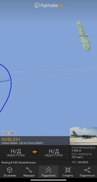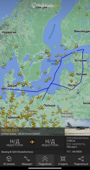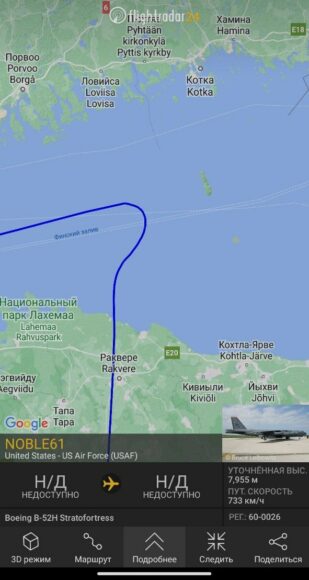 Как сообщил РБК, бомбардировщик вылетел с территории Польши, пролетел над Прибалтикой и, приблизившись к острову Гогланд в Финском заливе, развернулся и удалился в сторону Великобритании.