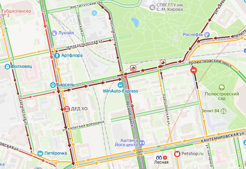 Позже пробки немного рассосались, однако до сих пор на 1-м Муринском и Лесном проспектах, а также окрестных улицах, по данным «Яндекс.Карт» сохраняются пробки.