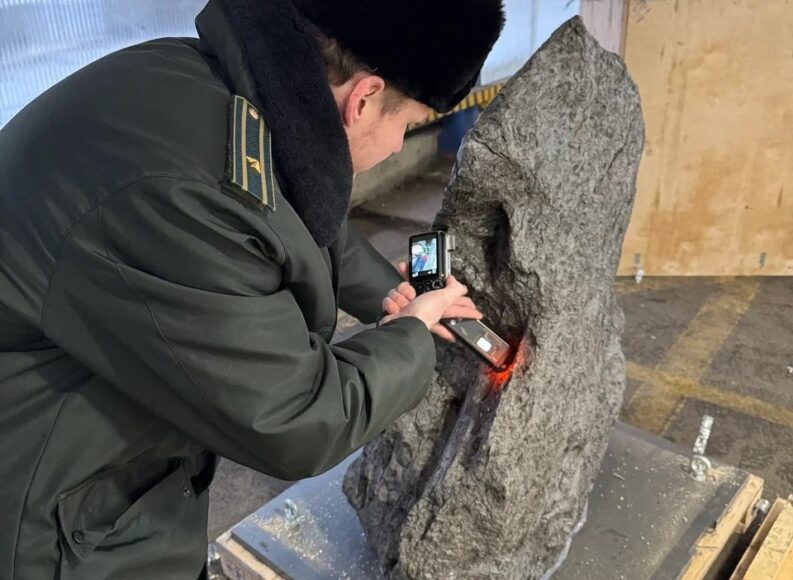 Огромный кусок метеорита, замаскированный под скульптуру, был обнаружен в морском контейнере на Балтийской таможне в Санкт-Петербурге.