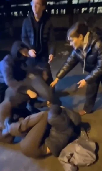 За кадром какая-то девушка, очевидно, из этой же компании убеждает дерущихся разойтись, а парни – наоборот – подзуживают продолжать, восхищаясь происходящим «кипешом», и участники импровизированного спарринга увлеченно молотят друг друга по лицу и голове, попутно оскорбляя. В какой-то момент к свалке присоединился молодой человек.