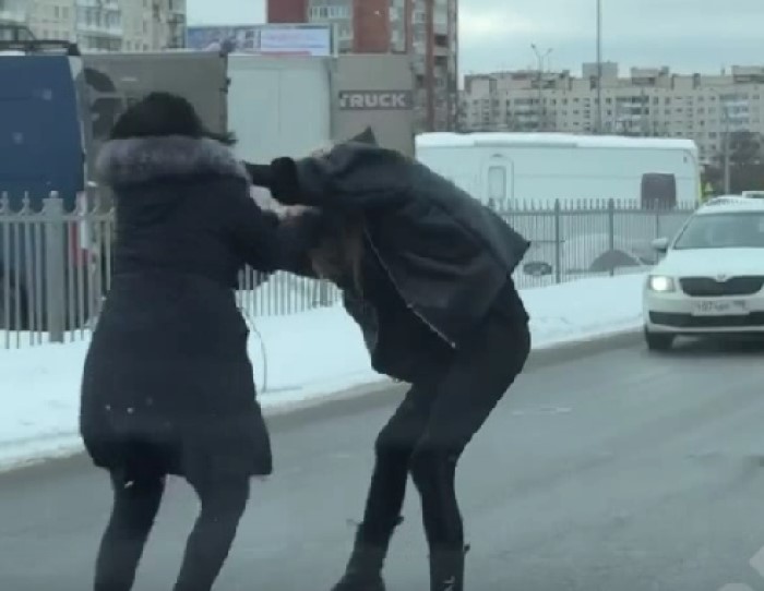 В Выборгском районе Петербурга две дамы решили выяснить отношения при помощи кулаков прямо посреди дороги.