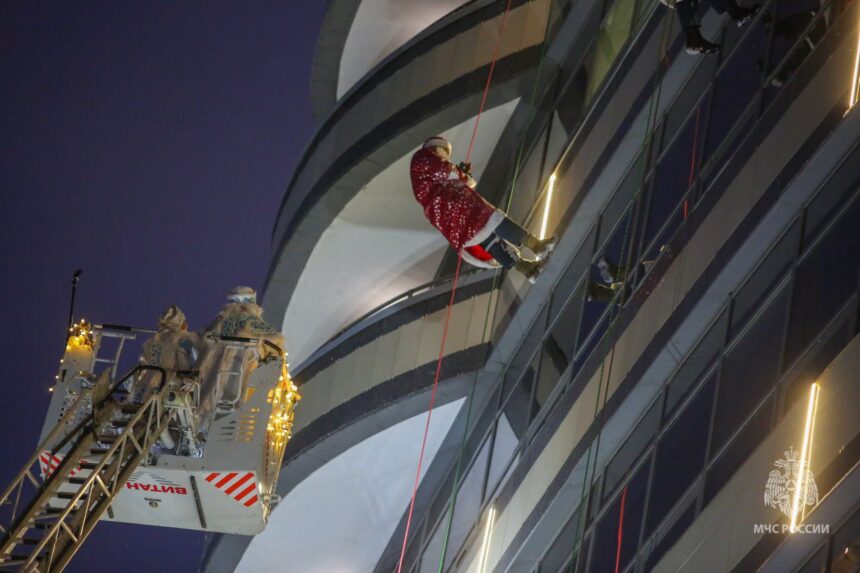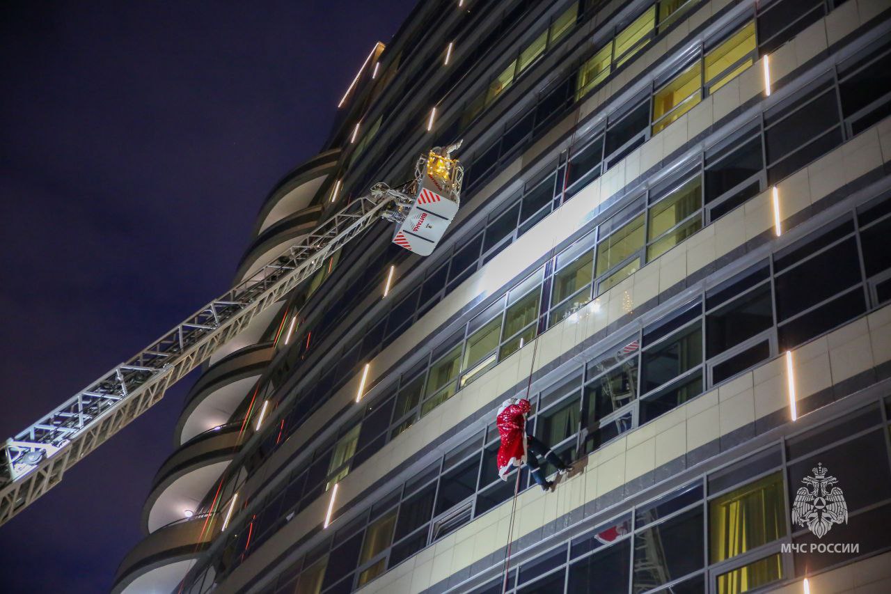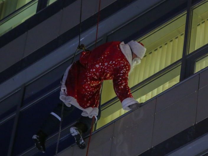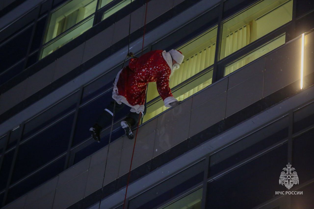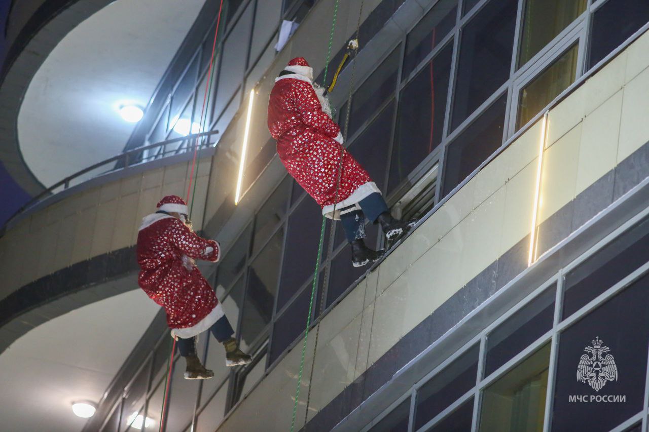 Одновременно еще двое дедов Морозов спускались с крыши на веревках и тоже приветствовали снаружи юных пациентов медучреждения.