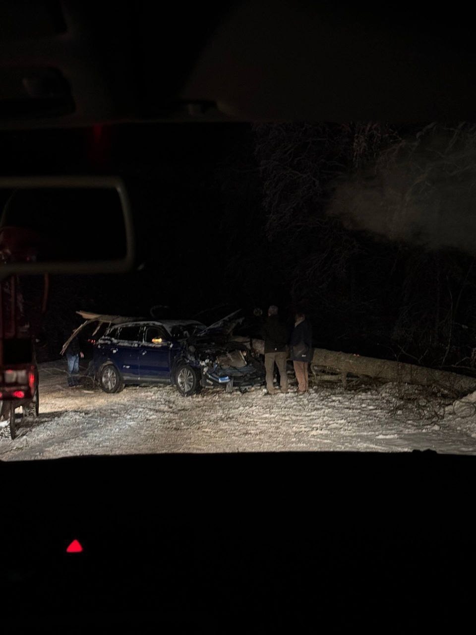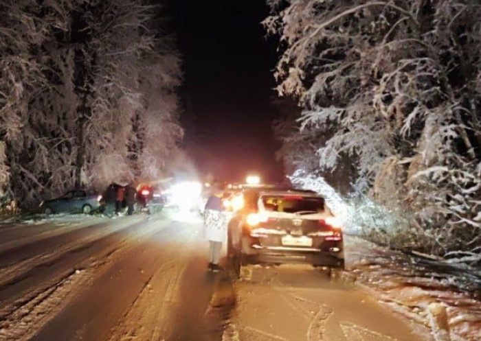 Столкнулись два легковых автомобиля, которые двигались по шоссе в попутном направлении. После этого одна из машин врезалась в упавшее на проезжую часть дерево.