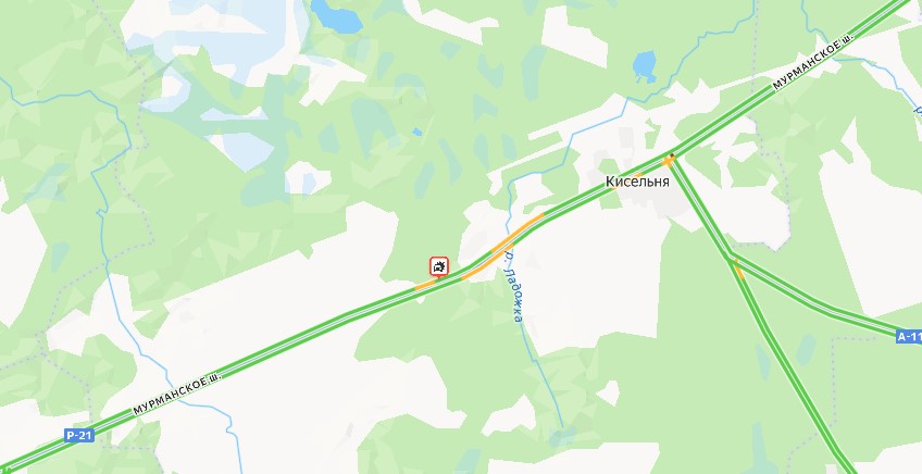 «Яндекс.Карты» «видят» ДТП на 104-м километре «Колы», в районе развязки с дорогой 41К-383 «Подъезд к садоводству «Пупышево»», на территории Кисельнинского сельского поселения.