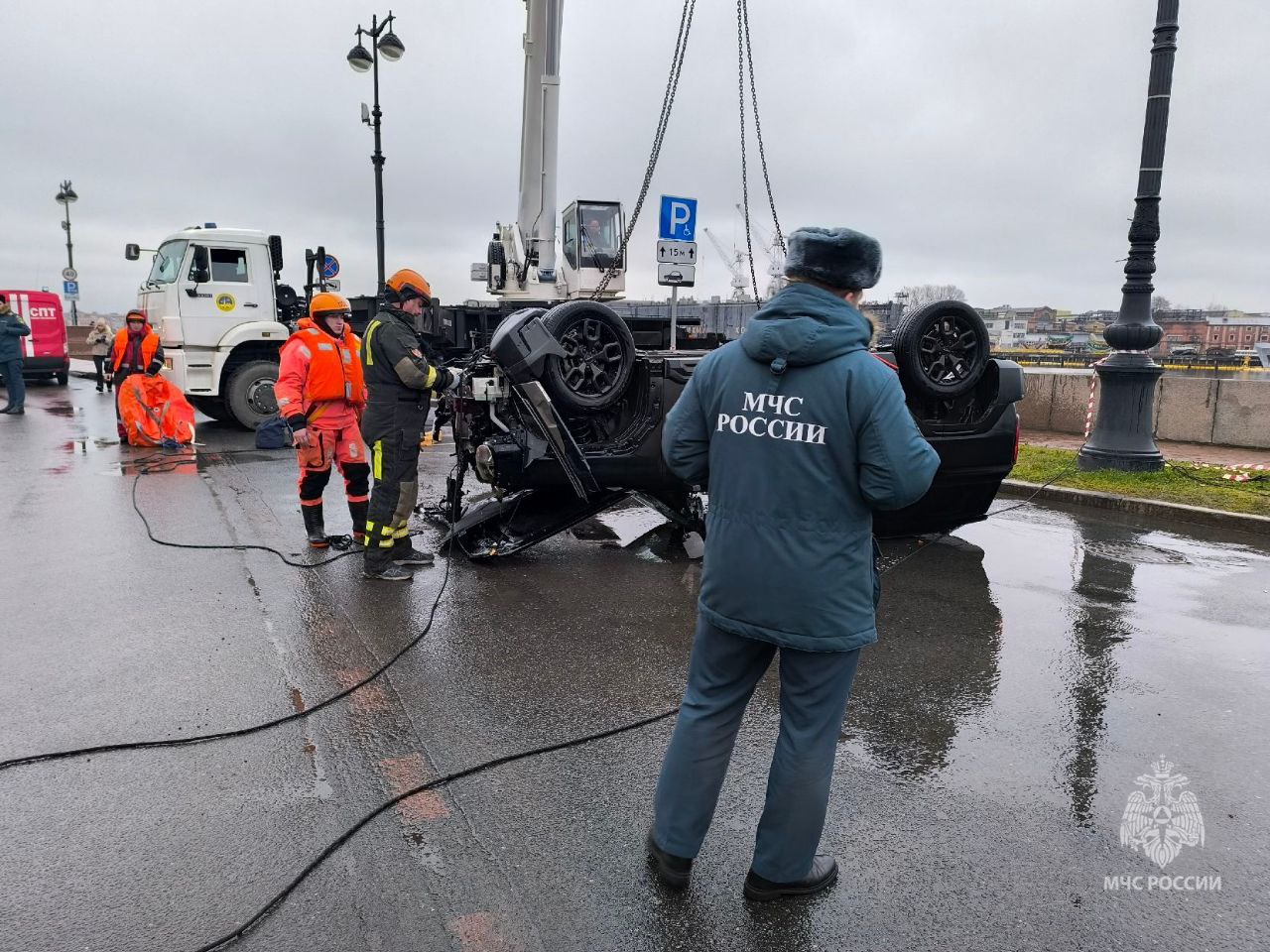 Автомобиль, улетевший ночью в реку на Васильевском острове в Петербурге, вытащили из воды при помощи крана. Появились подробности о том, как произошла авария.