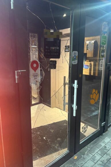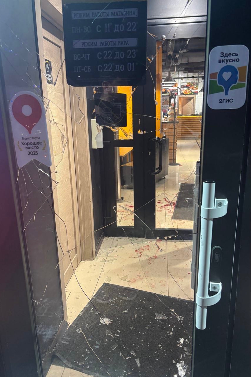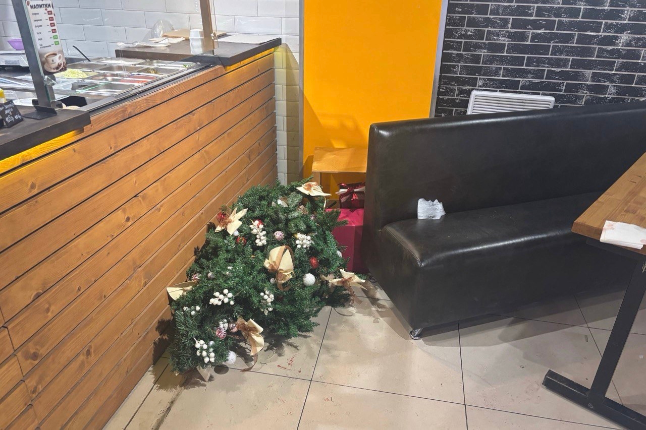 В кафе дерущиеся низвергли новогоднюю елку, раскидали мебель, разбили стекло двери и залили кровью пол.