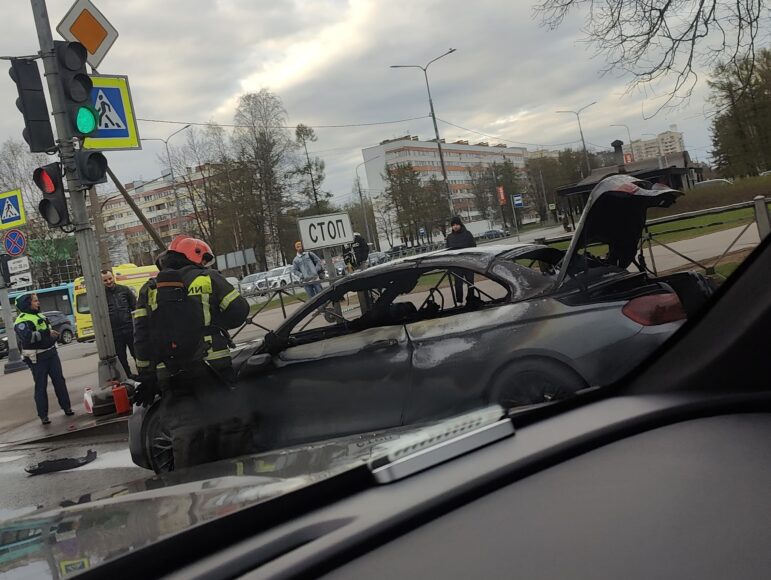 Как рассказали очевидцы в группе «ДТП-ЧП-СПб» ВКонтакте, «БМВ» задымился на ходу.