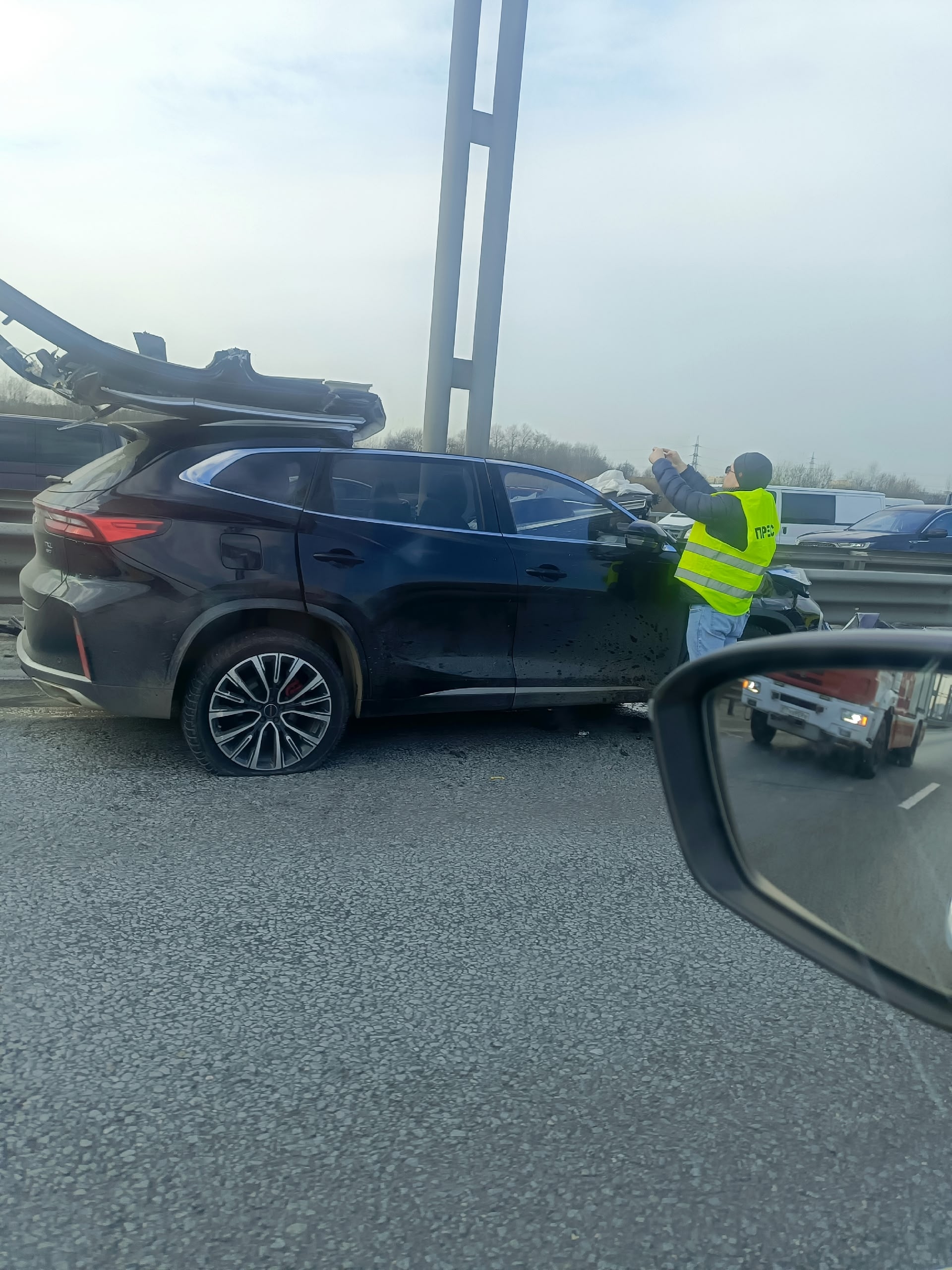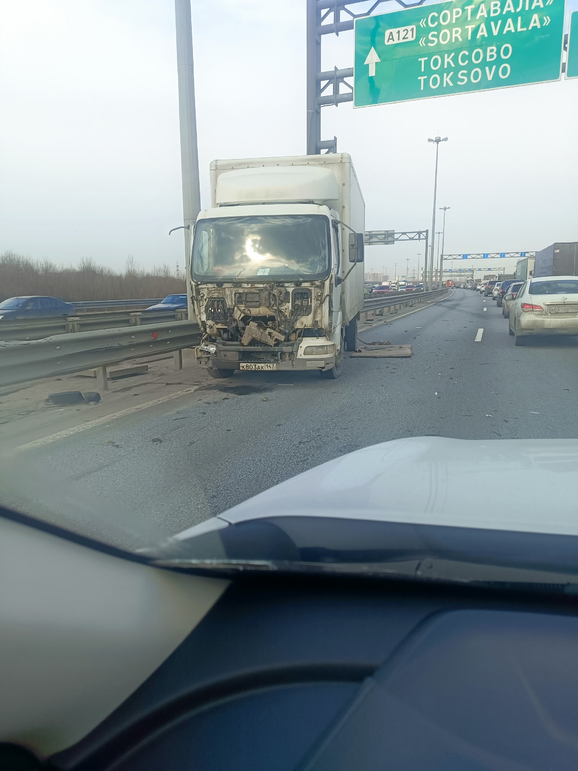 Грузовик столкнулся с кроссовером «Эксид» на 35-м километре внешнего кольца КАД у развязки с Пискарёвским проспектом.