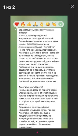 На еще одном видео, неизвестно каким образом оказавшемся в «коллекции» Фёдора, Анастасия обсуждает с другом из Казахстана возможность отправить троих из шести детей к их отцу, в Молдову.
