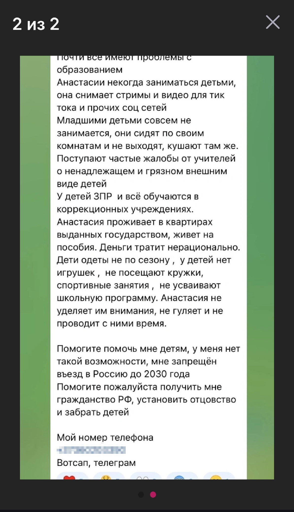Страсти накалились пару недель назад, после того как возлюбленный приехал в Петербург. На опубликованные в тиктоке ролики, где новоявленный отчим целует и обнимает детей Фёдора, тот отреагировал ярко. В сети появилось написанное им воззвание, в котором мужчина жалуется на плохое обращение Анастасии с младшими и выражает намерение официально оформить отцовство и забрать их.