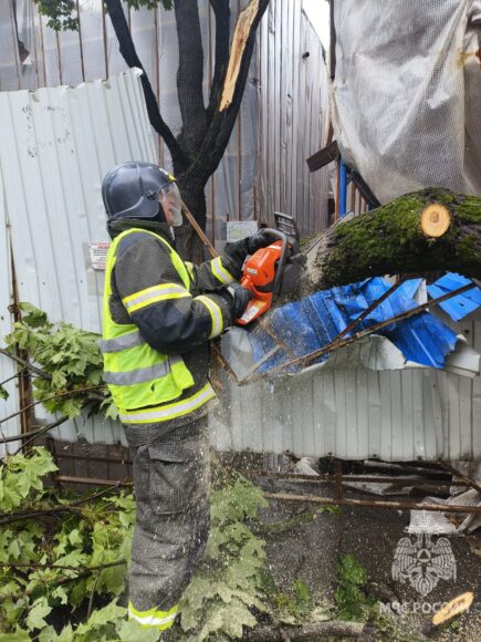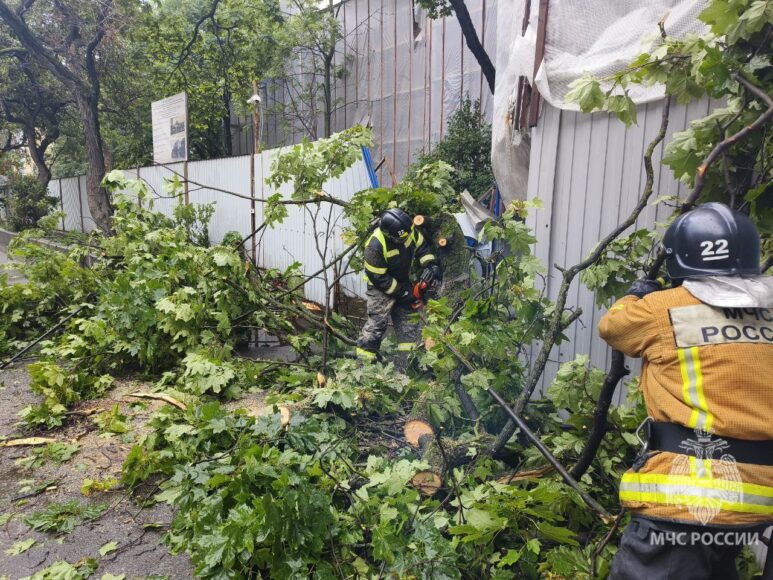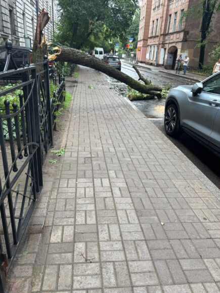 На Петроградке, в сквере у Первого медицинского университета на улице Льва Толстого дерево во время грозы упало на провода. Последствия ЧП устраняла аварийная служба.