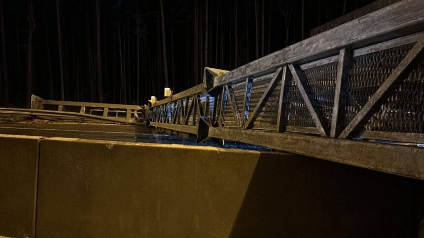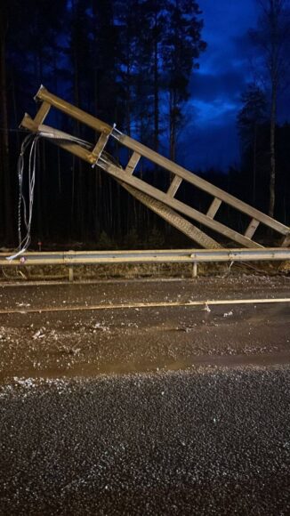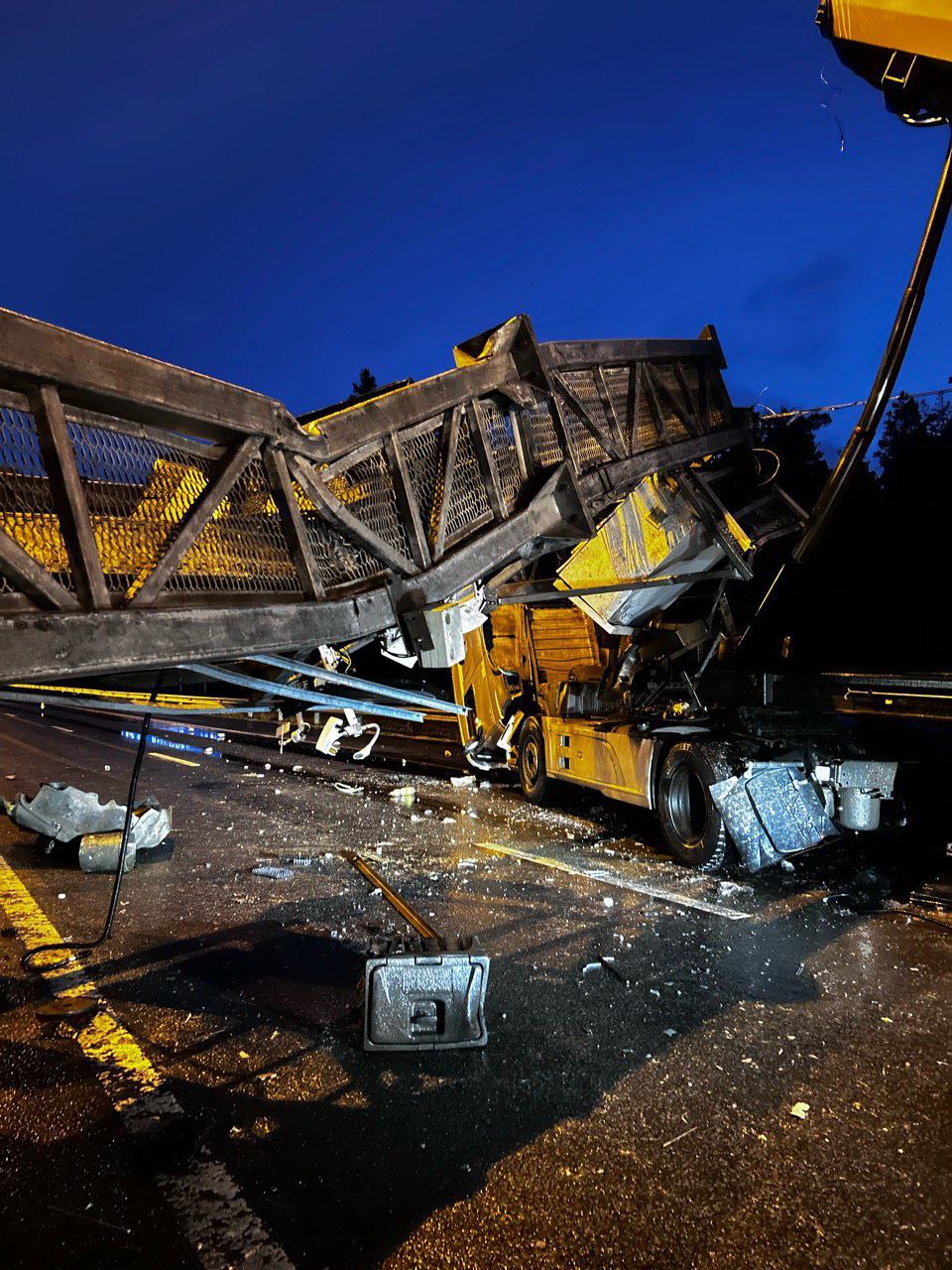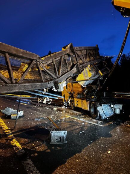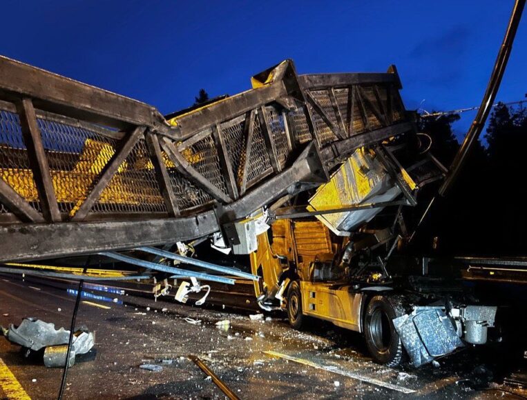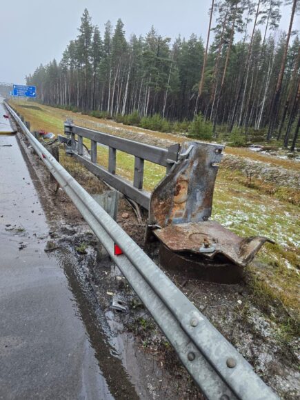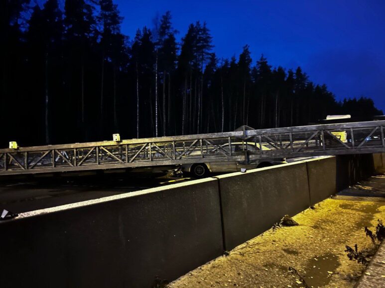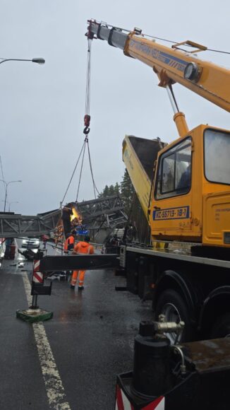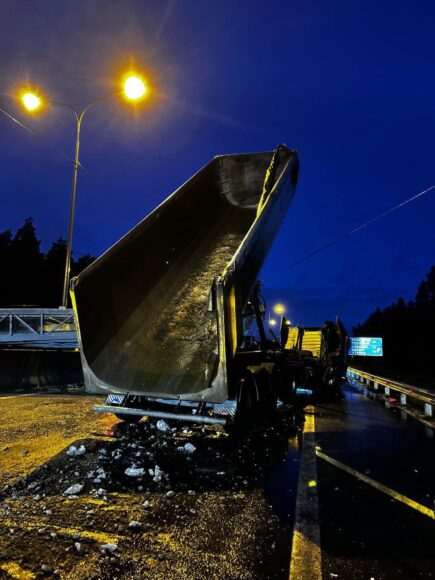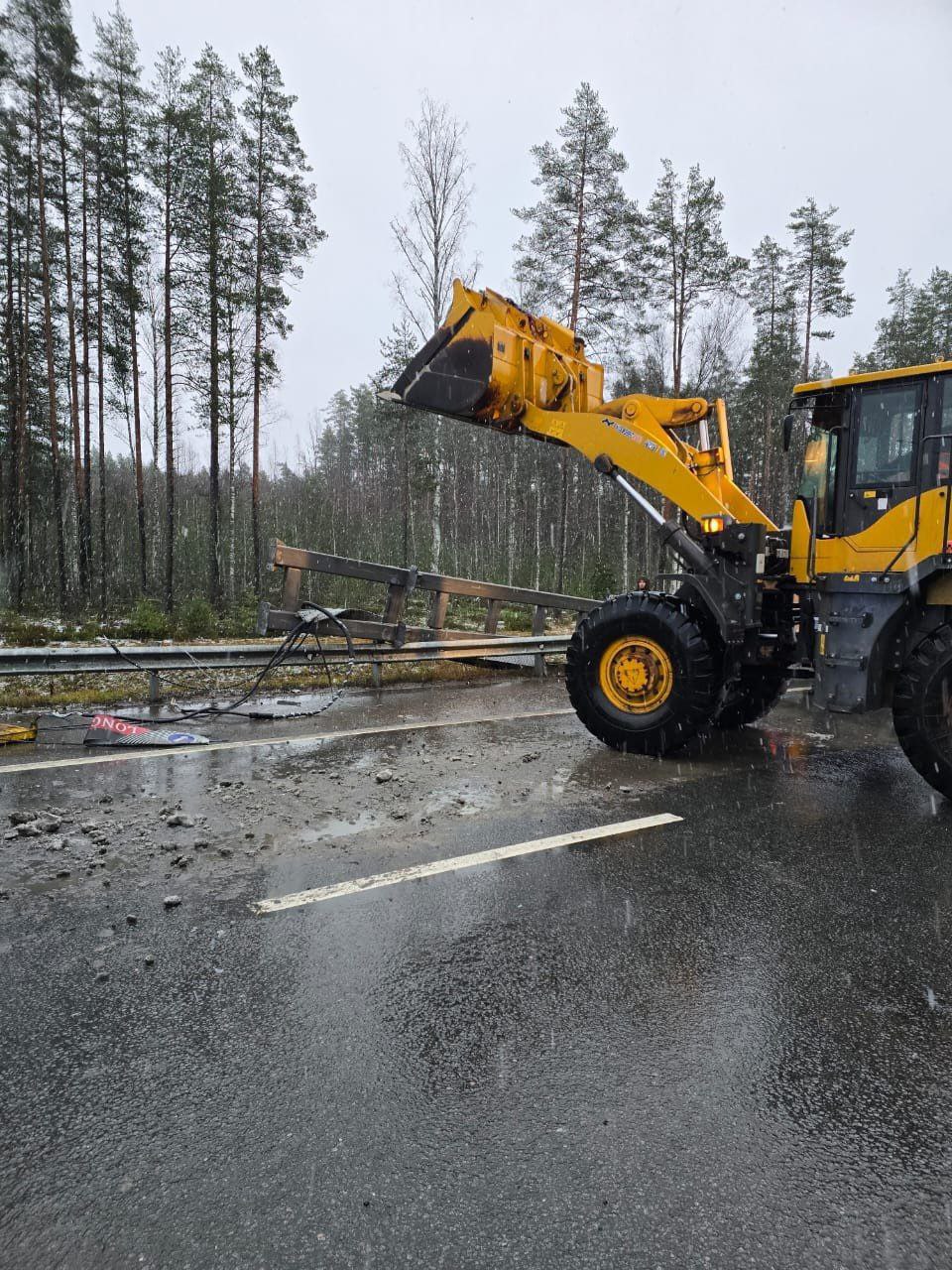 Грузовик с поднятым кузовом повалил металлическую раму на трассу «Сортавала». Движение полностью остановлено