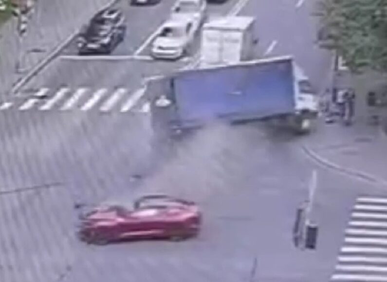 Видеокамера наблюдения записала, как спорткар, выехавший с Кантемировской на перекресток с Большим Сампсониевским проспектом, протаранил грузовик, который двигался в перпендикулярном направлении. Тот от удара съехал с проезжей части на тротуар, где сбил курьера на электровелосипеде, врезался в столб и опрокинулся.