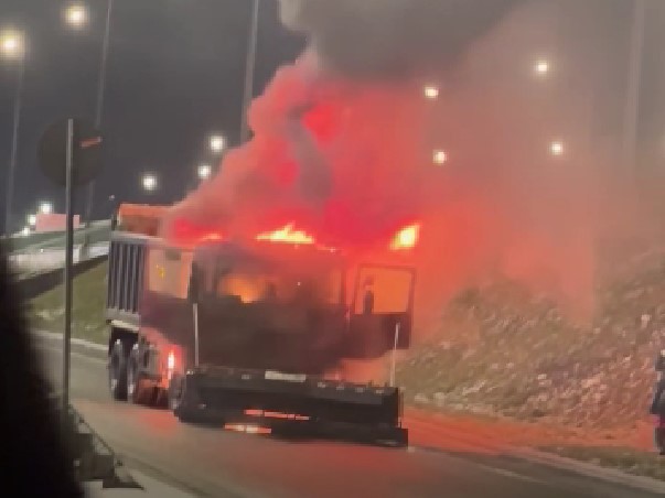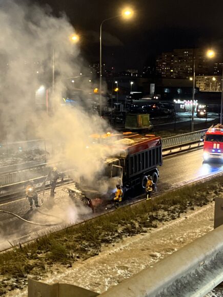 О полыхающем грузовике в ГУ МЧС сообщили в 21:22. Пламя охватило кабину грузового автомобиля, который двигался по разворотной петле на Шафировском проспекте возле гипермаркета «Лента».