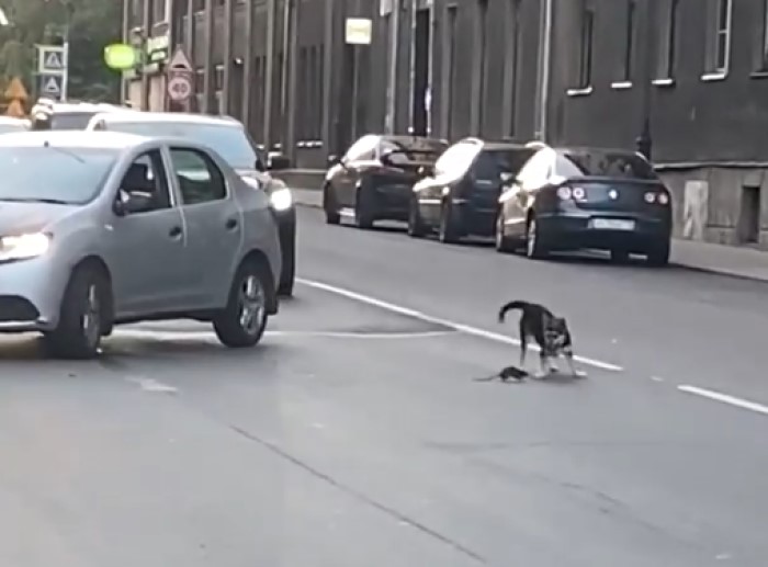 «Догонялки» начались на тротуаре, а закончились на проезжей части. Бегущую крысу и прыгавшую рядом собаку пришлось объезжать водителям.