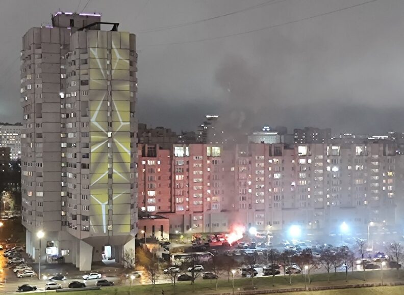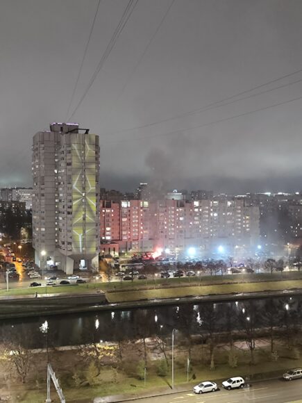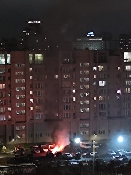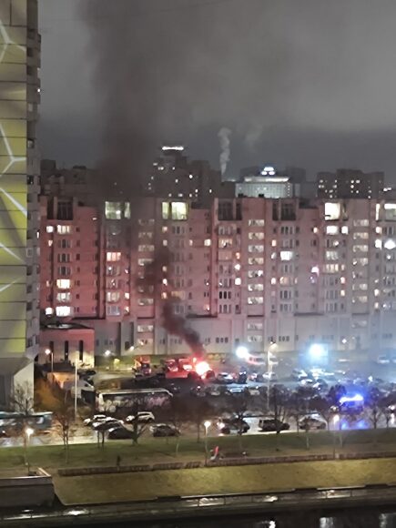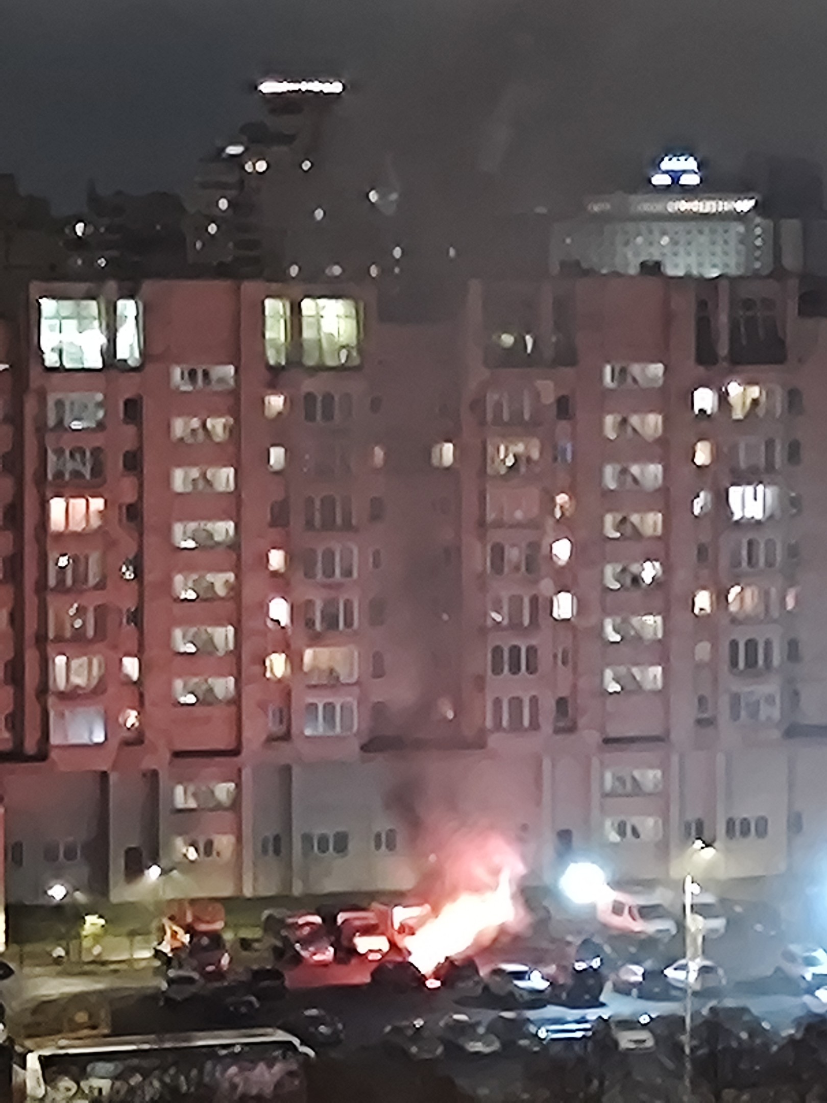Пожар произошел в восьмом часу вечера на платной охраняемой стоянке между домами №2 и №4 на Новосмоленской набережной, известными в народе как «дома на курьих ножках».