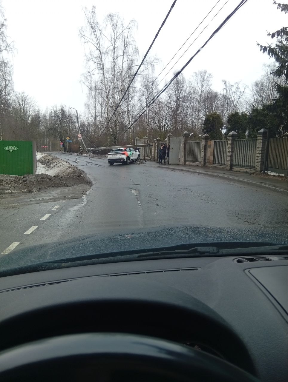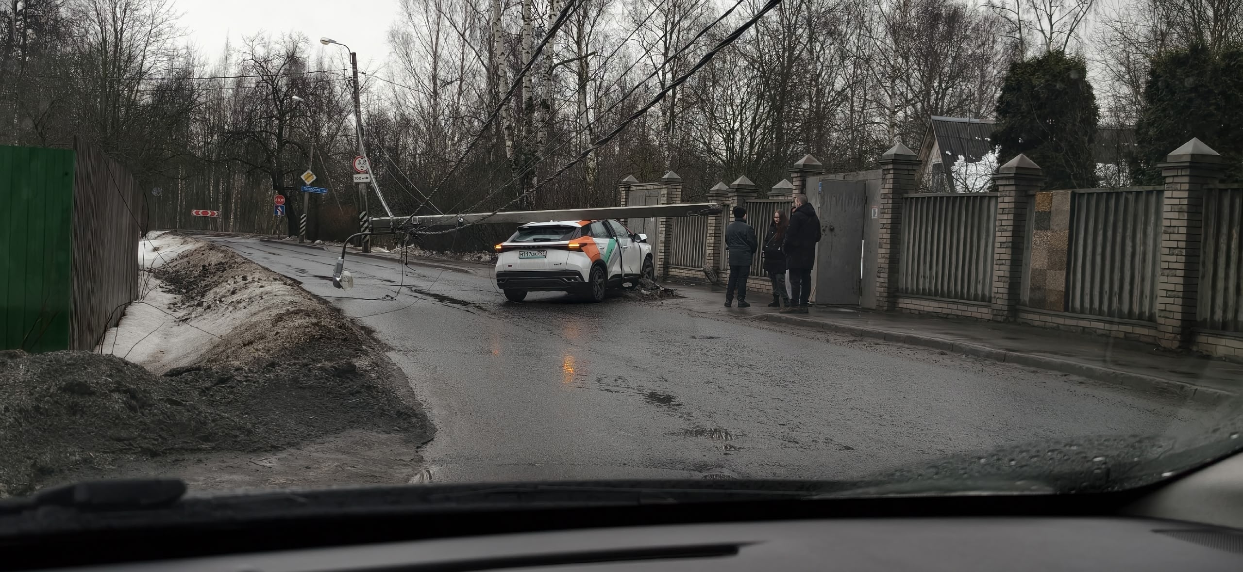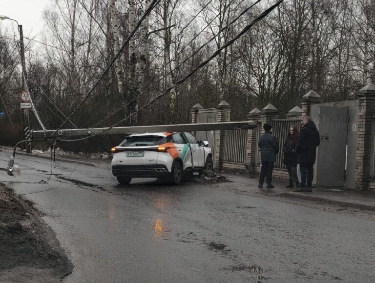 Авария произошла около пяти часов дня на Главной улице Пушкина, почти на границе с Павловском. Каршеринговый автомобиль «Омода C5» снес столб ЛЭП – да так, что опора улеглась ему на крышу, повисла на проводах и перегородила проезжую часть.