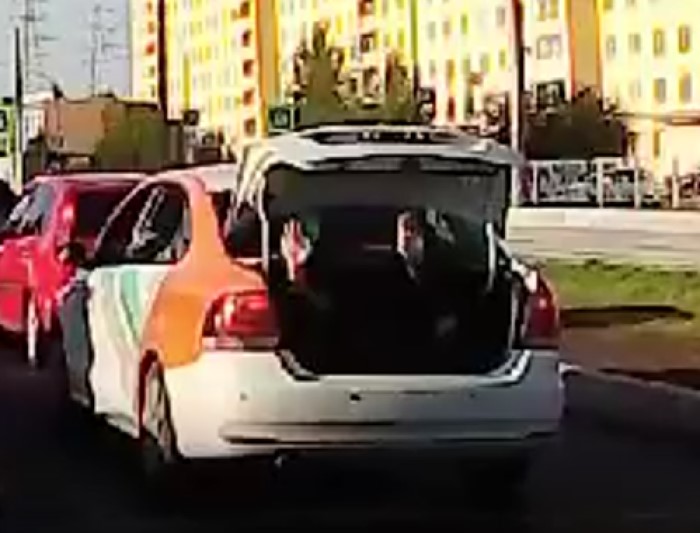 Петербургский водитель, остановившись перед светофором в Калининском районе, увидел, как багажник впереди идущего каршерингового автомобиля открылся и оттуда помахали.