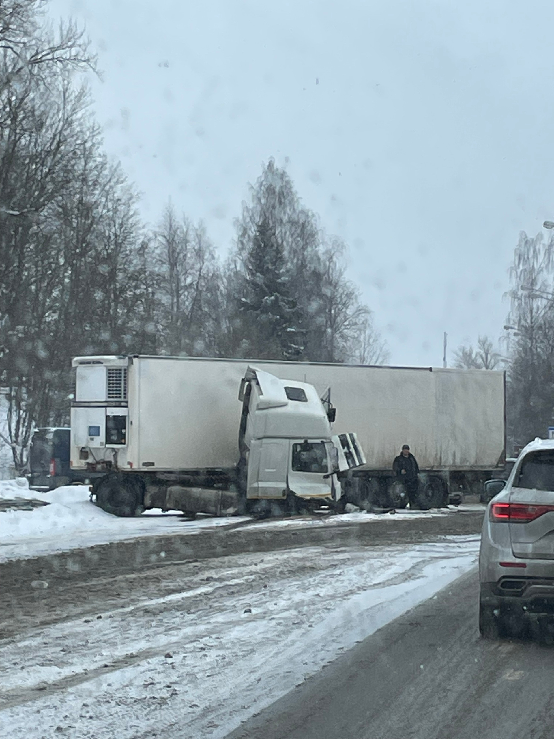 «На спуске под горку к мосту из-за снежника его на встречку потащило. В полосе-то удержался, но прицеп решил иначе», - описал аварию подписчик паблика.