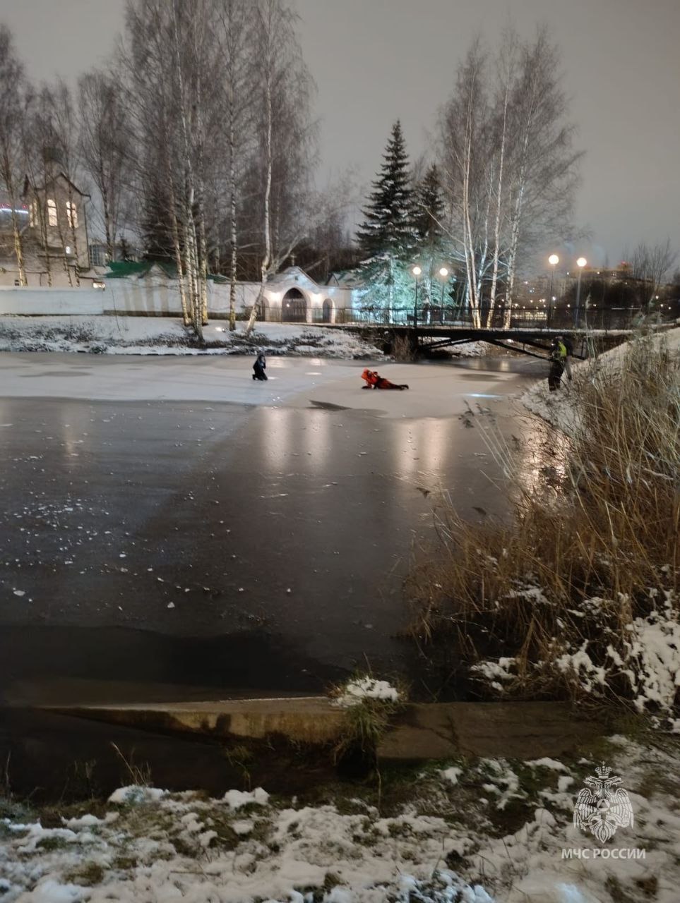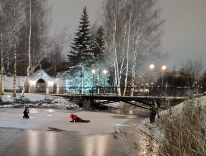 В Московском районе Петербурга спасатели МЧС ночью 27 ноября не без труда эвакуировали с тонкого льда на берег любительницу экстремальных прогулок.