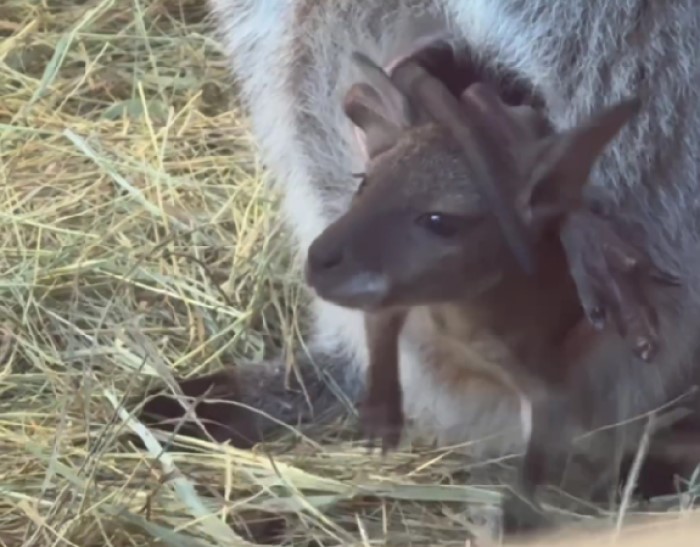 Малыши родились еще осенью, но увидеть их до недавнего времени было невозможно. Дело в том, что кенгуру Беннетта вынашивают потомство в утробе всего один месяц, а потом еще шесть месяцев уже родившийся, но еще совсем крохотных эмбрион развивается, не вылезая из теплой, уютной маминой сумке.