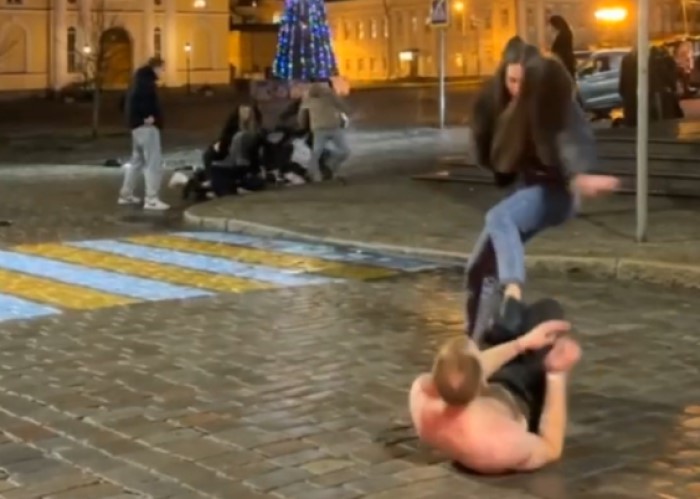На кадрах видео, опубликованного в телеграм-канале «Выборг Go», одна из девушек яростно пинает ногой сидящего на мощеном тротуаре полуголого парня, а в это время чуть поодаль другая участница конфликта пытается разнять сцепившихся друг с другом молодых людей.