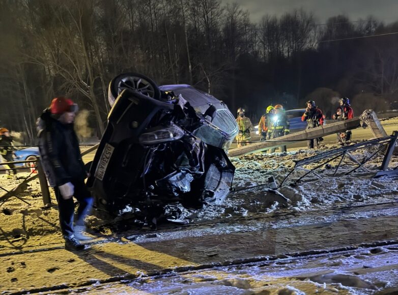 Один из участников ДТП – автомобиль марки «БМВ X5» вылетел на трамвайные пути, повалив опору ЛЭП, и опрокинулся на бок.