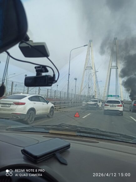Два легковых автомобиля столкнулись в третьем часу дня на 57-м километре КАД, на вантовом мосту у съезда на проспект Обуховской Обороны. Одна из машин от удара загорелась.