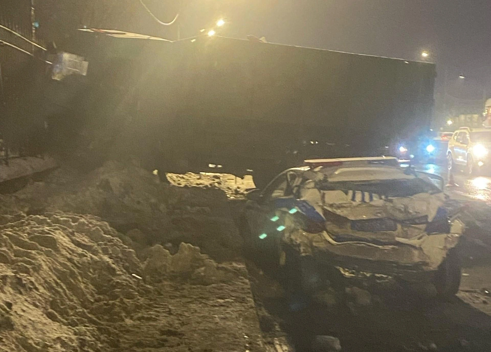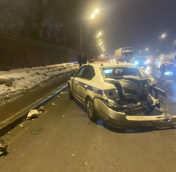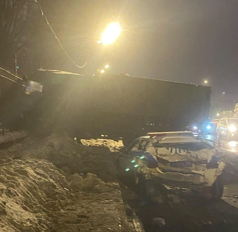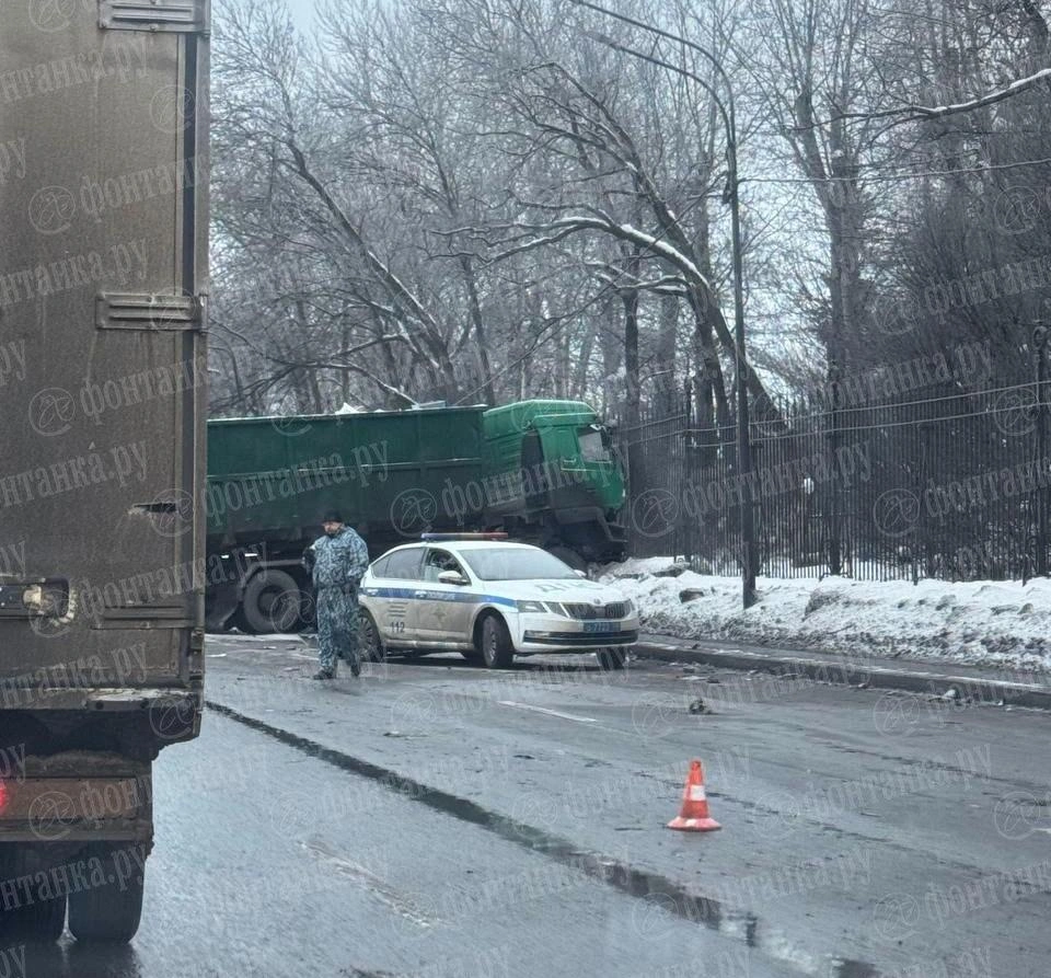 Мусоровоз протаранил автомобиль ГАИ на Пулковском шоссе, а тот по инерции врезался еще в одно полицейское авто. Пострадали двое детей
