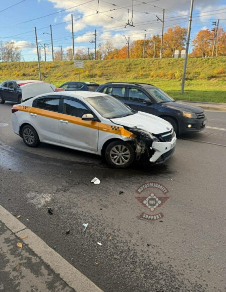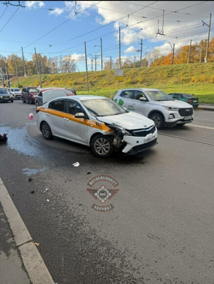 Авария с участием автомобиля такси и мотоцикла в Выборгском районе Петербурга закончилась переломом ноги байкера и «травмами» у его железного коня.