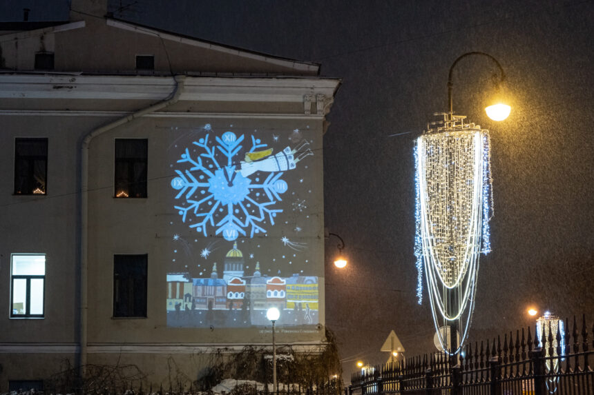 В преддверии Нового года фасады жилых домов украсили световыми инсталляциями с детскими рисунками.