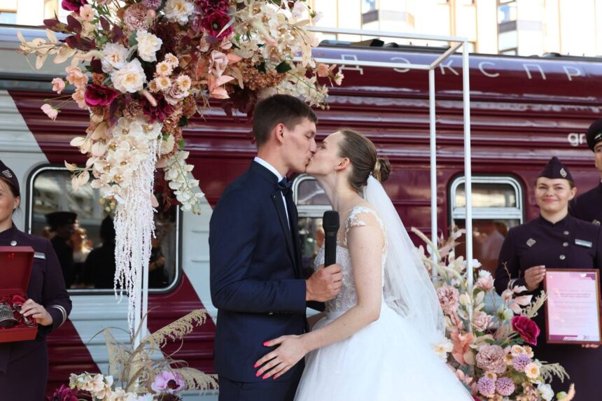 Для празднования юбилея железнодорожный перевозчик выбрал концепцию семейных ценностей. Так, прямо на платформе вокзала впервые провели свадебную церемония для двух пар. Одна из них состоит в браке уже 20 лет и сегодня отмечает фарфоровую свадьбу, вторая вместе – год. Провел мероприятие начальник поезда. Участники получили подарки и фотосессию в люксовом купе.