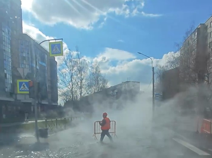 Трубу прорвало около 11:45 на перекрестке проспекта Испытателей с Серебристым бульваром. На проезжую часть вылилось целое море горячей воды, и окрестности заволокло горячим паром.