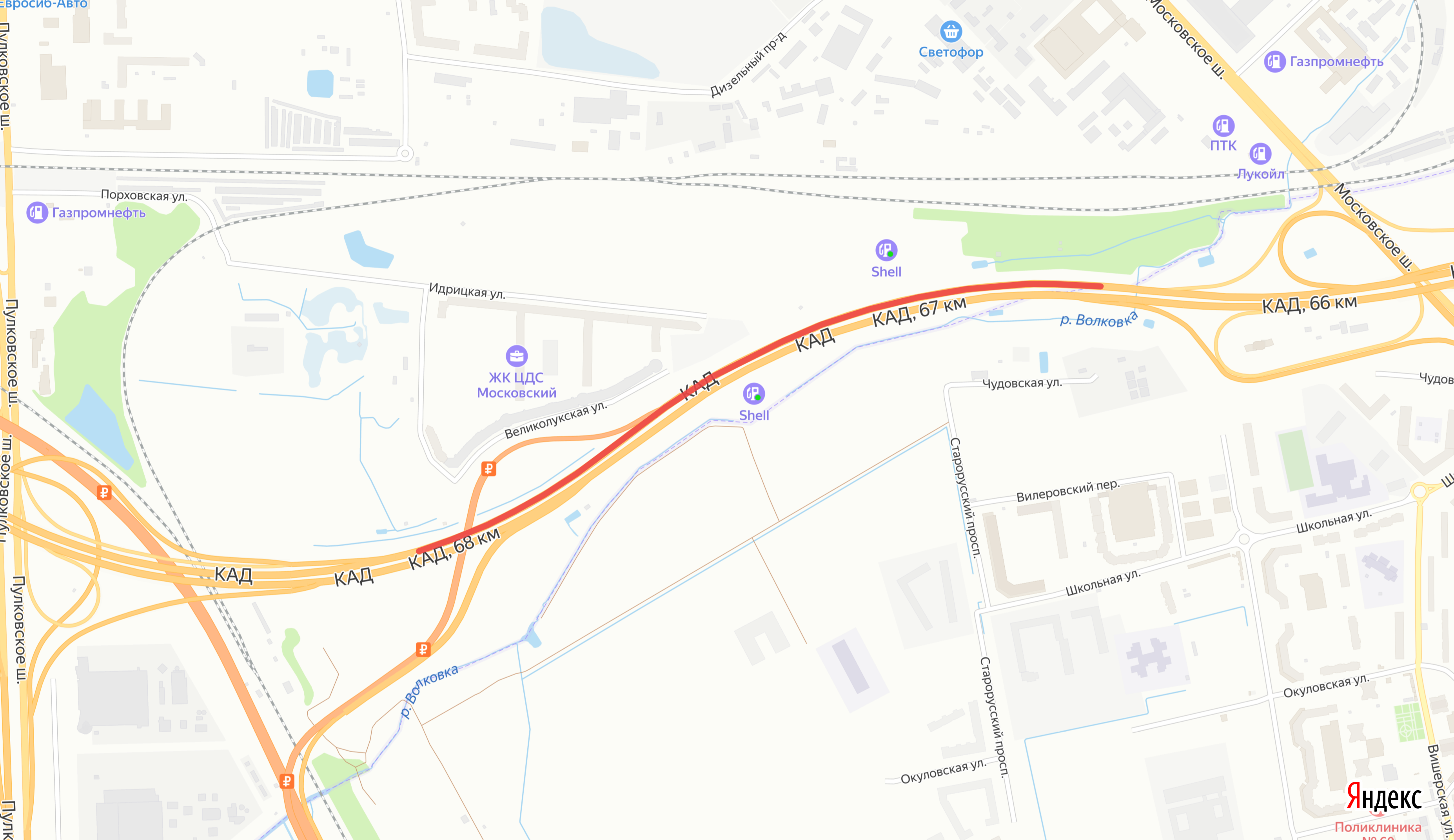 На участке между развязкой на пересечении с Московским шоссе и развязкой на пересечении с Пулковским шоссе будет перекрыта четвертая полоса. На полосах с первой по третью будет введено ограничение скорости транспорта до 50 км/ч.