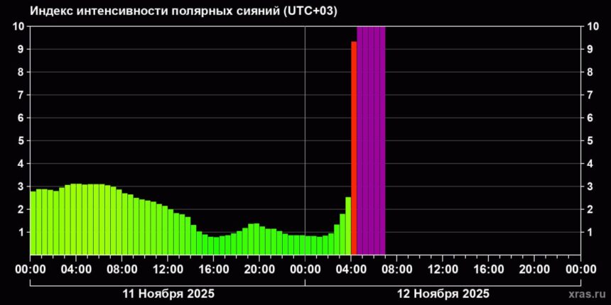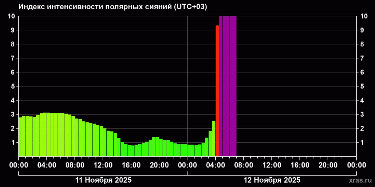 «Над планетой на фоне происходящих событий в данный момент формируется одна из самых мощных за последние годы зон полярных сияний, пик которой сейчас находится в западном полушарии (США, Канада), где опускается до широт около 40 градусов. Хвост полярного овала должен был успеть зацепить северные и северо-западные регионы страны. В ближайшие часы можно ожидать массового прихода оттуда фотографий и иных визуальных подтверждений», - говорится в посте, опубликованном рано утром среды в тг-канале Лаборатории.