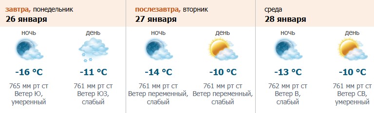 Температура воздуха в понедельник, 26 января, днем будет колебаться от -10 до -12°C, во вторник и среду, 27 и 28 января, - от -9 до -11°C. На дорогах будет гололедица.