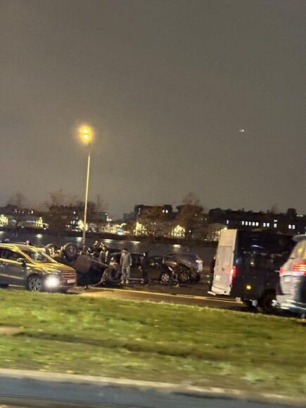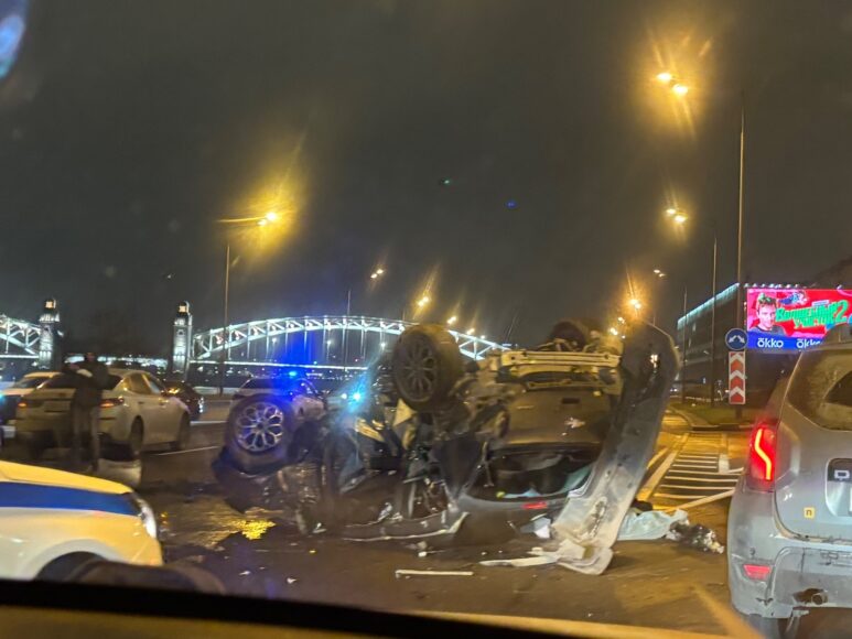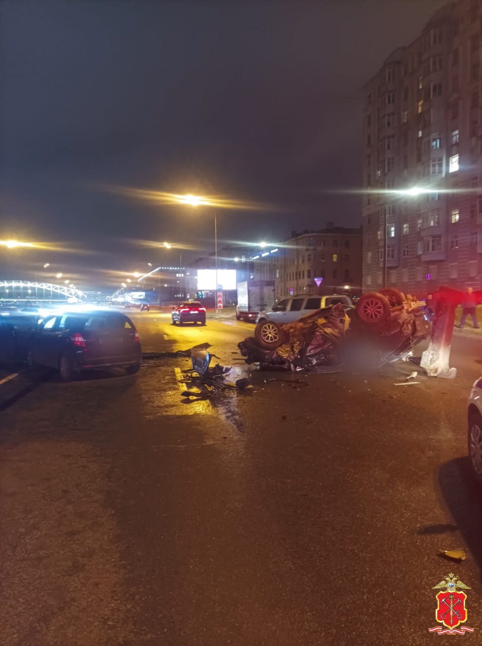 Три легковых автомобиля столкнулись у дома №16 на Малоохтинской набережной. Одна из легковушек от удара задымилась, а другая перевернулась на крышу.