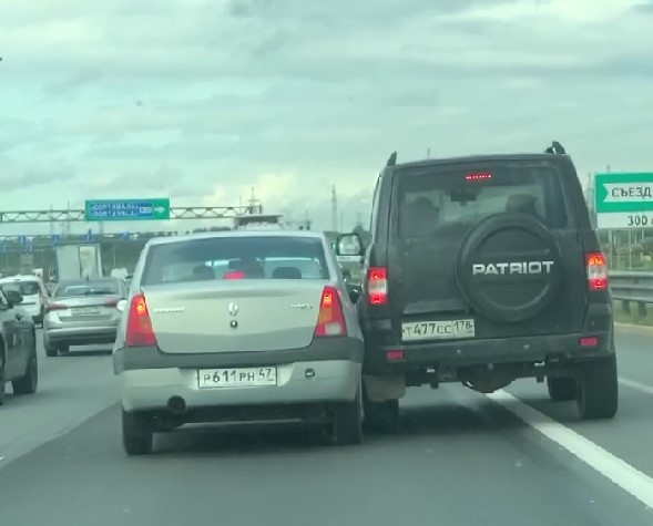 «УАЗ Патриот» пытался обосноваться в правом ряду, перестроившись с обочины. Его упрямо не пускал водитель попутного «Рено Логана». В конце концов машины столкнулись.