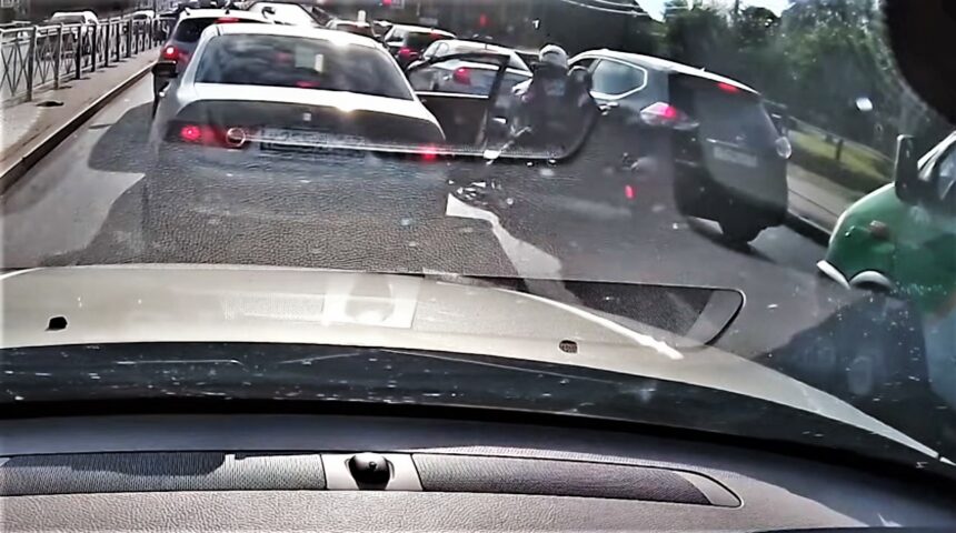 Мотоциклисту и его пассажиры не повезло в этот момент проезжать мимо. Их железный конь врезался в дверь и опрокинулся правым боком на внедорожник, стоявший в соседнем ряду.