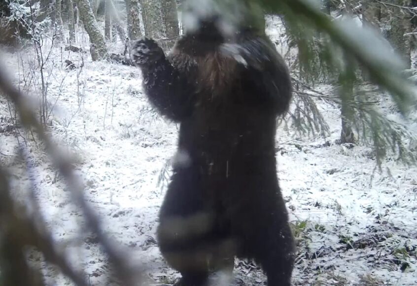 Видеоловушка в лесной чаще на территории заповедника в Лодейнопольском районе Ленинградской области записала медведя, который никак не хочет угомониться и продолжает танцевать даже на снегу, потираясь о деревья.