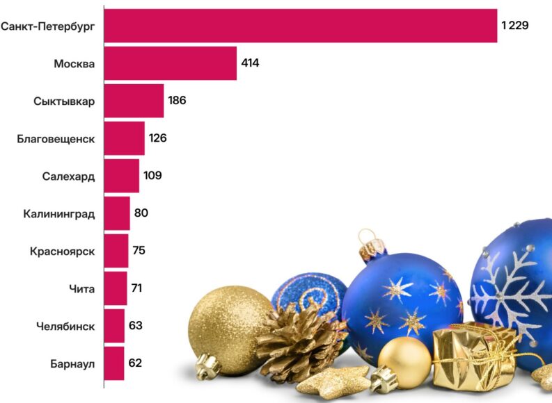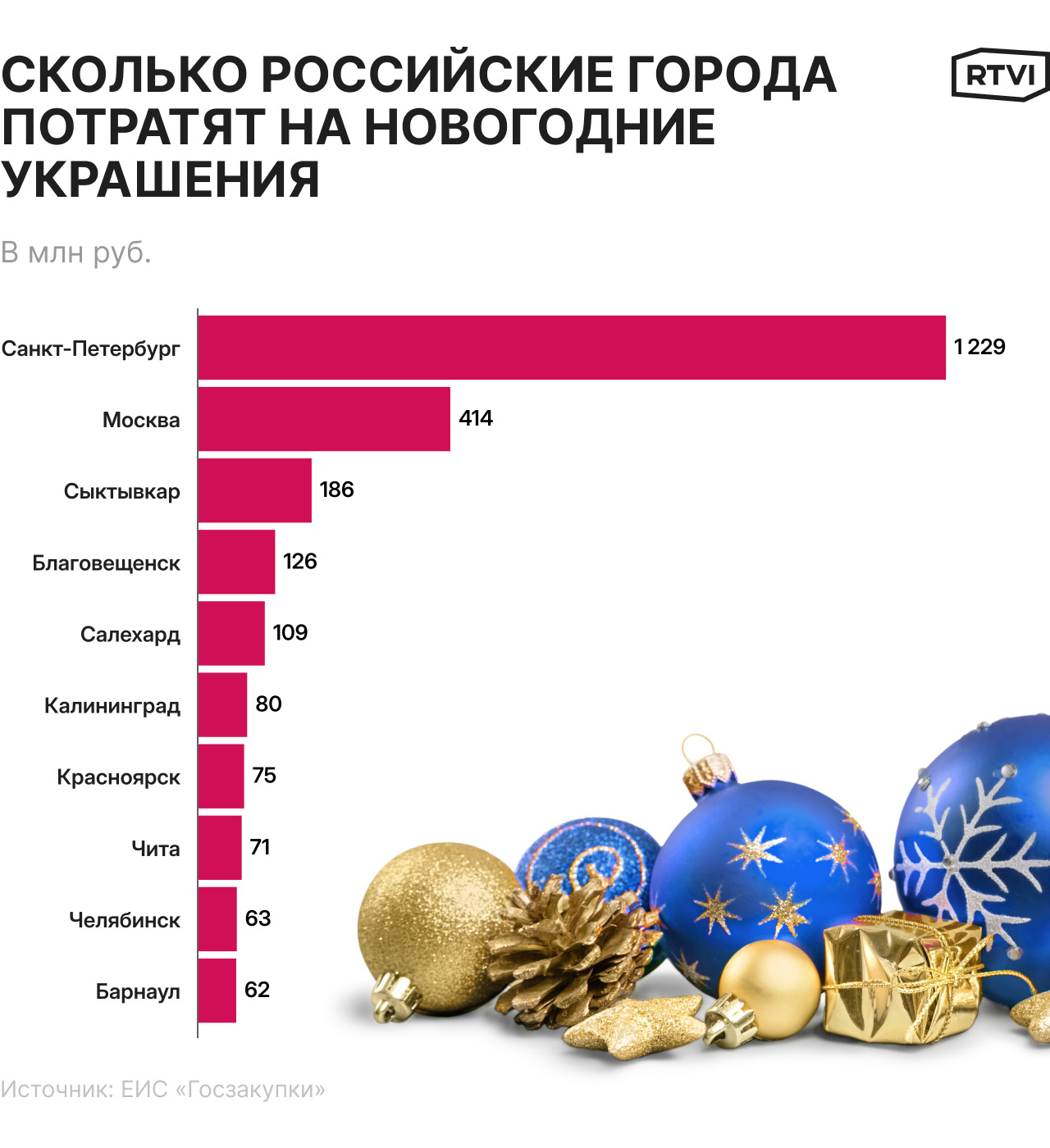 Удивительно и то, что петербургский размах оказался втрое большим московского: там за новогодние украшения заплатили «всего» 414 миллионов.
