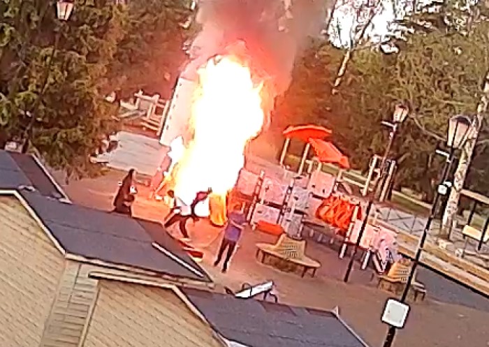 Площадка у дома №2/3 на Октябрьском шоссе поселка Рахья полыхала в ночь на 20 июля. Камера, установленная неподалеку, записала, как компания из пятерых ребят сперва крушила скамейки, а затем собралась у горки. Парни долго возились возле деревянной конструкции, после чего от нее пошел дым. Позже разгорелось пламя. Подростки сперва пытались потушить огонь, забрасывая его песком, но, поняв, что дело зашло слишком далеко, поспешили покинуть место преступления.