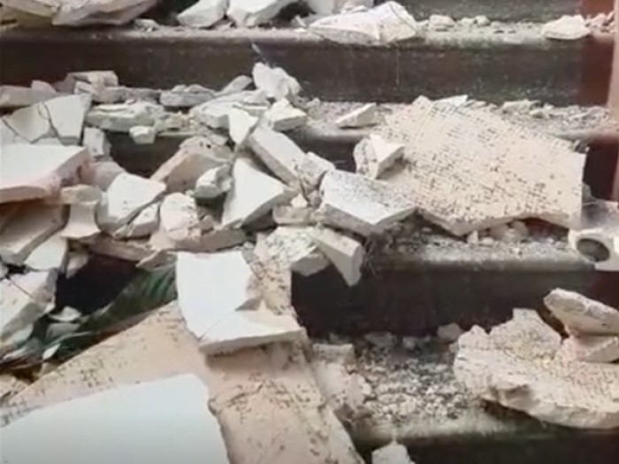 Обломками засыпало лестницу и холл в филиале ЛГУ имени А. С. Пушкина в городе Выборге, на Выборгской улице, 2. ЧП произошло днем 17 сентября во время занятий обвалился потолок.