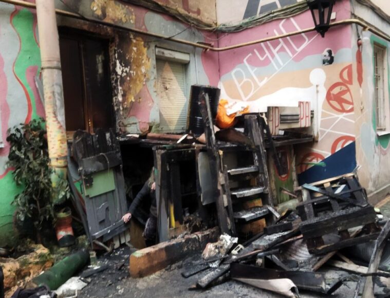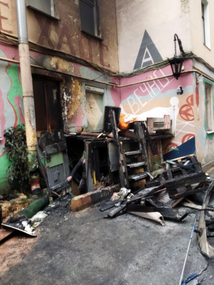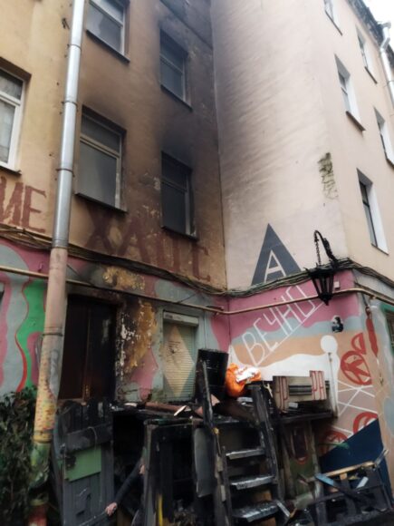 Огонь горел в ночь на 27 ноября в знаменитом «дворике Нельсона» в Петроградском районе Петербурга, который местный художник украсил рисунками и инсталляциями.