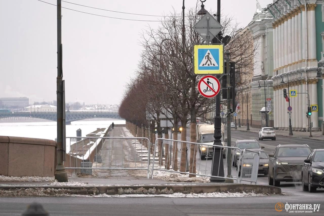 С утра опустела Дворцовая площадь. По всему периметру ее огородили заборами, прохожих выгнали. Возле ограждений стоит коммунальная спецтехника и машины полиции.