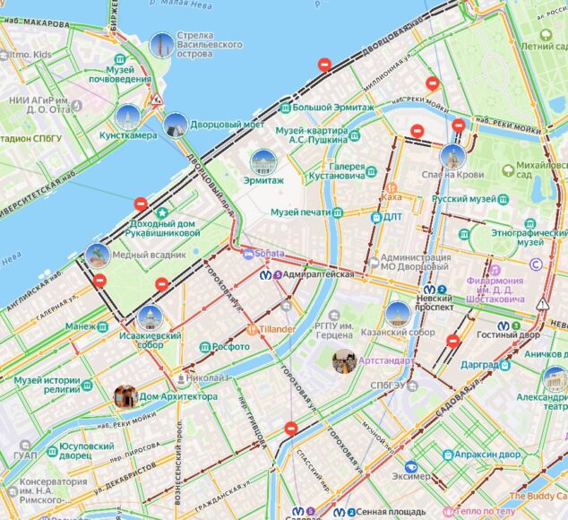 «Яндекс.Карты» показывают, что перекрыты Дворцовый мост, Дворцовая и Адмиралтейская набережные, Адмиралтейский проезд. Невский проспект стоит в пробке, которая растянулась от Дворцового проезда до канала Грибоедова.