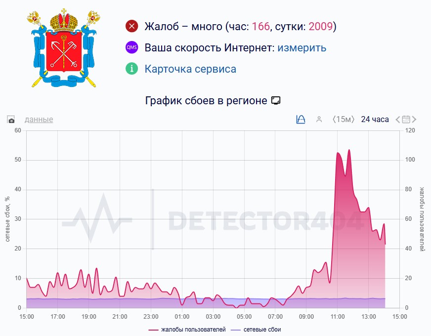 По данным сайта Downdetector, в городе наблюдается сбой в работе мобильного интернета. Количество жалоб резко увеличилось примерно с 11 часов утра.