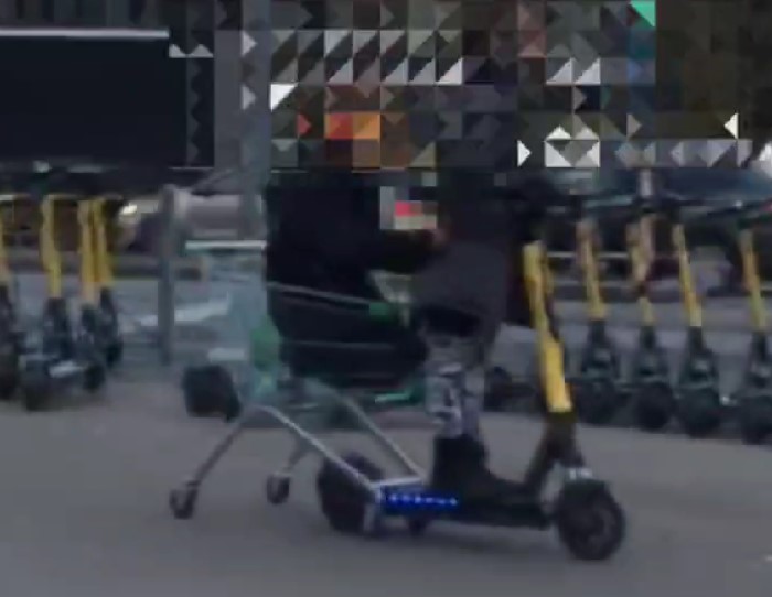 Двое мальчиков среднего школьного возраста сцепили тележку из супермаркета с самокатом. Один рулил средством индивидуальной мобильности, второй забрался в прицеп.