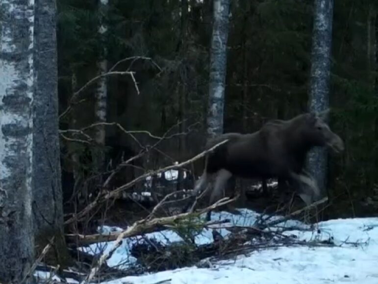 Кадрами, на которых лосиха бросается следом за пробежавшим мимо волком, поделились на днях в соцсетях сотрудники Нижне-Свирского заповедника. На видео мать не одна – за ней бежит лосенок.